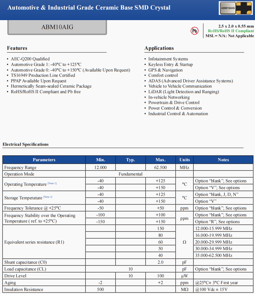 | ABM10AIG-16.000MHZ-J4Z-T3 | Abracon | ABM10AIG | 16 MHz | ±50ppm | ±30ppm | 10 pF |