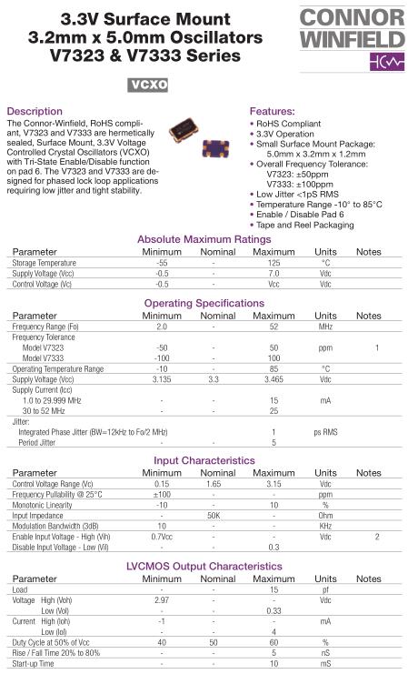 ConnorWinfield晶振,V7323晶振,V7323-26.00MHz晶振,5032mm體積的石英晶體振蕩器,有源晶振,該產品可驅動2.5V的溫補晶振,壓控晶振,VC-TCXO晶體振蕩器產品,電源電壓的低電耗型,編帶包裝方式,可對應自動高速貼片機自動焊接,及IR回流焊接(無鉛對應),為無鉛產品,超小型,質地輕.產品被廣泛應用到集成電路,程控交換系統,無線發射基站.