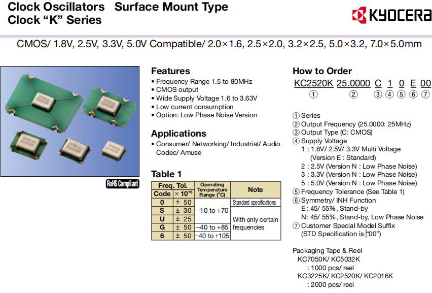 | KC2520K40.0000C1GE00 | Kyocera有源振蕩器 | KC2520K, Kyocera | 40MHz | 1.6 V ~ 3.63 V | -40°C ~ 85°C |