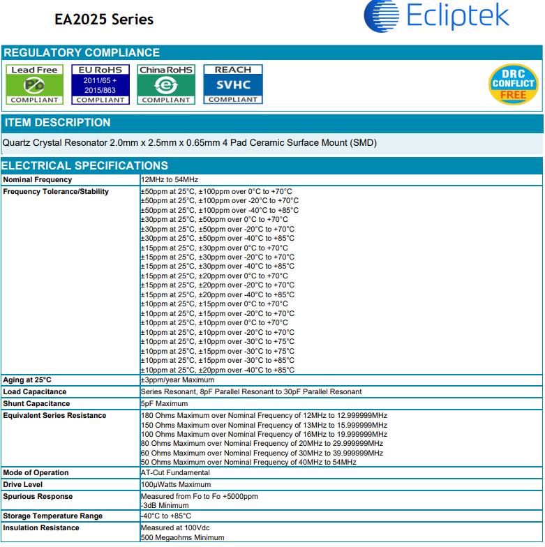 日蝕晶振EA2025,EA2025MA10-32.000M-TR水晶振動子,Ecliptek晶振,美國進口晶振,石英晶體諧振器,SMD晶體,無源晶體,音叉晶體,型號EA2025,編碼EA2025MA10-32.000M-TR是一款金屬面貼片型的水晶振動子,尺寸為2520mm,頻率32MHZ,精度15ppm,負載10PF,工作溫度-40~+85°C,產品具備良好的穩定性能,比較適合智能家居,電子產品等領域.