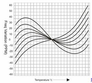 圖2顯示了各種AT切角的一些典型頻率/溫度曲線。頻率隨溫度的變化是非常可預(yù)測的,因此可以在溫補晶振(TCXO)中使用晶體元件