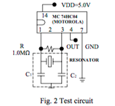 陶瓷諧振器的測(cè)試電路陶瓷諧振器:帶內(nèi)置電容器:它由帶有反饋電阻Rf的CMOS反相器組成(圖2).反饋電阻允許在最初施加電源時(shí)啟動(dòng)振蕩.其值通常為1MΩ.Cl和C2的值在表中給出或由客戶(hù)指定.