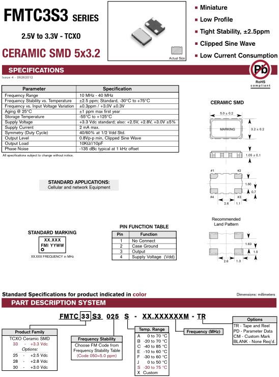 | Frequency Stability vs. Temperature | ±2.5 ppm; Standard, -30°C to +75°C | |