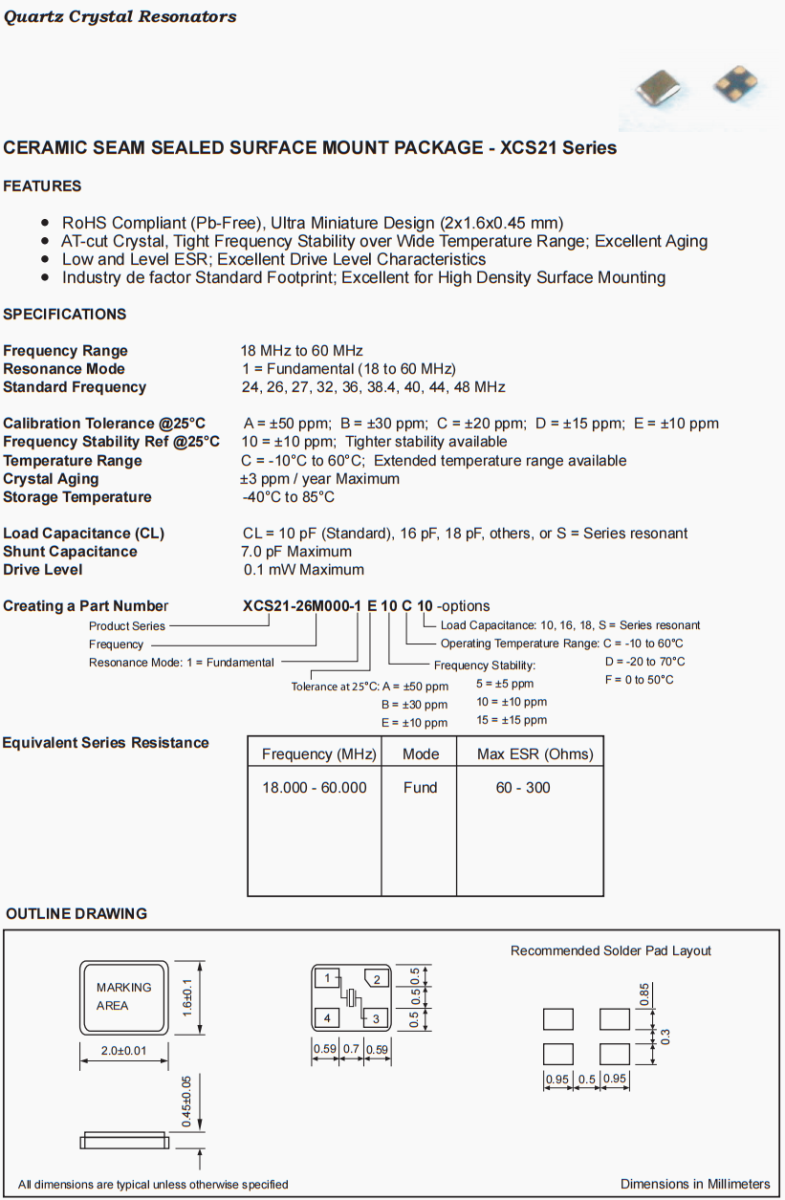 Fortiming高品質(zhì)晶振,XCS21-19M020-1E10C10環(huán)保晶振,工業(yè)機(jī)器人晶振,美國(guó)Fortiming晶振公司,富通晶振,SMD晶振,超小型晶振,2016晶振,北斗導(dǎo)航模塊晶振,醫(yī)療設(shè)備晶振,低損耗晶振,四腳晶振,低成本晶振,環(huán)保無(wú)鉛晶振,高穩(wěn)定性晶振,石英晶振,貼片晶振,6G網(wǎng)絡(luò)終端晶振,無(wú)源晶振,陶瓷SEAM密封表面貼裝封裝- XCS21系列,特點(diǎn),符合RoHS標(biāo)準(zhǔn)(無(wú)鉛),超小型設(shè)計(jì)(2x1.6x0.45 mm), at切割晶體,寬溫度范圍內(nèi)緊密的頻率穩(wěn)定性;優(yōu)異的老化性能,低水平的ESR;卓越的驅(qū)動(dòng)級(jí)特性,行業(yè)標(biāo)準(zhǔn)的足跡;非常適合高密度表面安裝