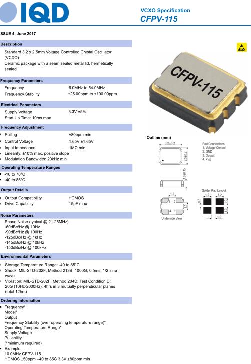 IQD晶振,CFPV-115晶振,10.0MHz-CFPV-115晶振,壓控晶振(VCXO),壓控石英晶體振蕩器基本解決方案,PECL輸出,輸出頻率60MHz到200MHz之間,出色的低相位噪聲和抖動(dòng),三態(tài)功能,應(yīng)用:SDH/SONET,以太網(wǎng),基站,筆記本晶振應(yīng)用,符合RoHS/無(wú)鉛.IQD伊克德晶振集團(tuán)有超過(guò)40年的生產(chǎn)頻率元件產(chǎn)品經(jīng)驗(yàn),在頻率控制市場(chǎng)上,IQD是公認(rèn)的市場(chǎng)領(lǐng)導(dǎo)者.擁有60多個(gè)國(guó)家的活躍客戶,伊克德提供了最全面的晶振晶體頻率范圍,從低成本的商業(yè)級(jí)產(chǎn)品到高可靠性工業(yè)、汽車和軍事等級(jí)的應(yīng)用,包括:晶振,石英貼片晶振,水晶振蕩子,晶體振蕩器,壓控溫補(bǔ)晶振,石英晶體諧振器等.