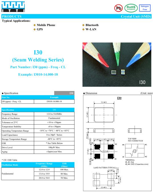 ITTI晶振,I30晶振,I3010-14.000-18晶振,超小型表面貼片型SMD晶振,最適合使用在汽車電子領(lǐng)域中,也是特別要求高可靠性的引擎控制用CPU的時(shí)鐘部分.低頻晶振可從7.98MHz起對(duì)應(yīng),小型,超薄型具備強(qiáng)防焊裂性,石英晶體在極端嚴(yán)酷的環(huán)境條件下也能發(fā)揮穩(wěn)定的起振特性,產(chǎn)品本身具有耐熱,耐振,耐撞擊等優(yōu)良的耐環(huán)境特性,滿足無鉛焊接以及高溫回流溫度曲線要求,符合AEC-Q200標(biāo)準(zhǔn).
