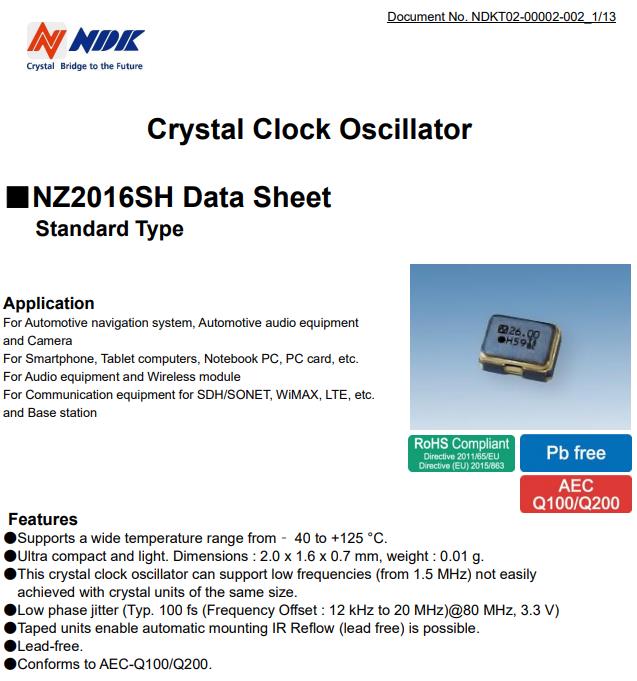 NZ2016SH-24.000MHZNSC5022C貼片振蕩器,NDK車載有源晶振NZ2016SH 參數(shù)表