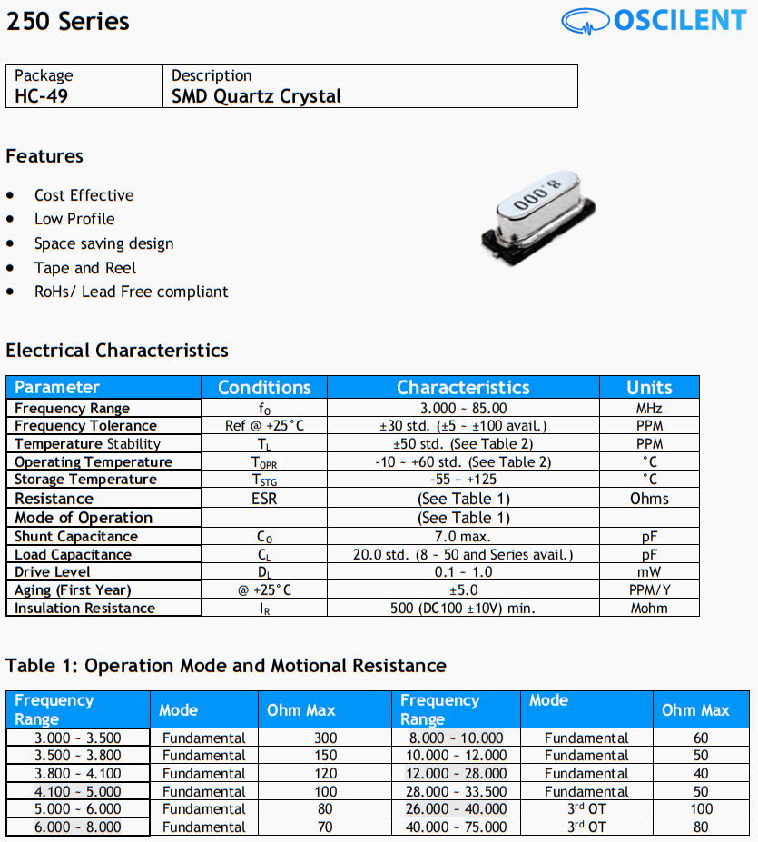 250-4.0M-18-S-TR晶振,進(jìn)口奧斯康利49SMD晶振,6G室外基站晶振