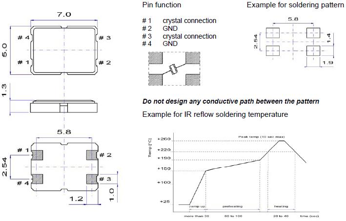 加熱包裝材料至+150°C以上會(huì)破壞產(chǎn)品特性或損害產(chǎn)品。如需在+150°C以上焊接晶體產(chǎn)品,建議使用SMD產(chǎn)品。在下列回流條件下,對(duì)晶體產(chǎn)品甚至SMD產(chǎn)品使用更高溫度,會(huì)破壞產(chǎn)品特性。建議使用下列配置情況的回流條件。安裝這些產(chǎn)品之前,應(yīng)檢查焊接溫度和時(shí)間。同時(shí),在安裝條件更改的情況下,請(qǐng)?jiān)俅芜M(jìn)行檢查。如果需要焊接的石英晶體產(chǎn)品在下列配置條件下進(jìn)行焊接,請(qǐng)聯(lián)系我們以獲取耐熱的相關(guān)信息。