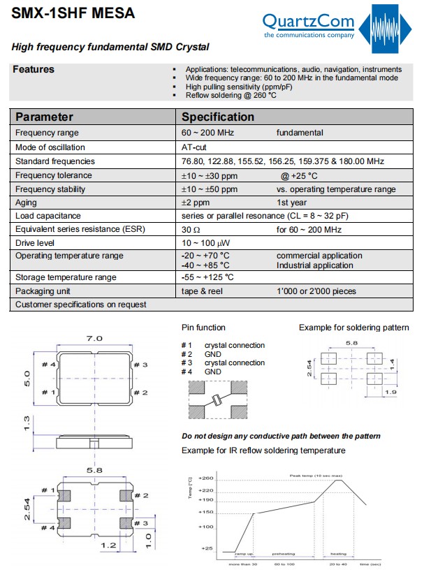 QuartzCom晶振,SMX-1SHF晶振,四腳貼片晶振,QuartzCom晶振在全球范圍內(nèi)都深受客戶的歡迎,1994在瑞士成立,隔了4年又在美國建立了分公司,所有QuartzCom石英晶振產(chǎn)線都有專人專業(yè)化管理,無鉛化,綠色生產(chǎn)是QuartzCom Crystal最基礎(chǔ)的標(biāo)準(zhǔn),二十多年.1994年Hedi和Hans Rudolf Haas成立QuartzCom歐洲公司(瑞士)