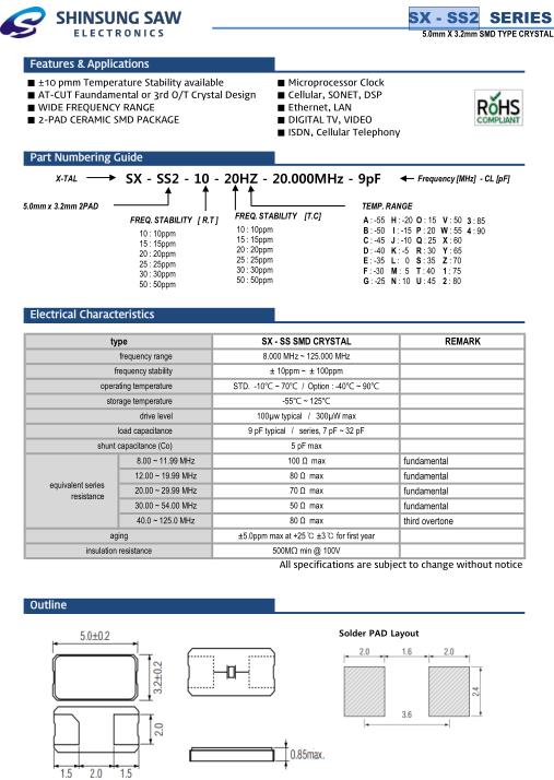 SHINSUNG晶振,SX-SS2晶振,SX-SS2-10-20HZ-20.000MHz-9pF晶振