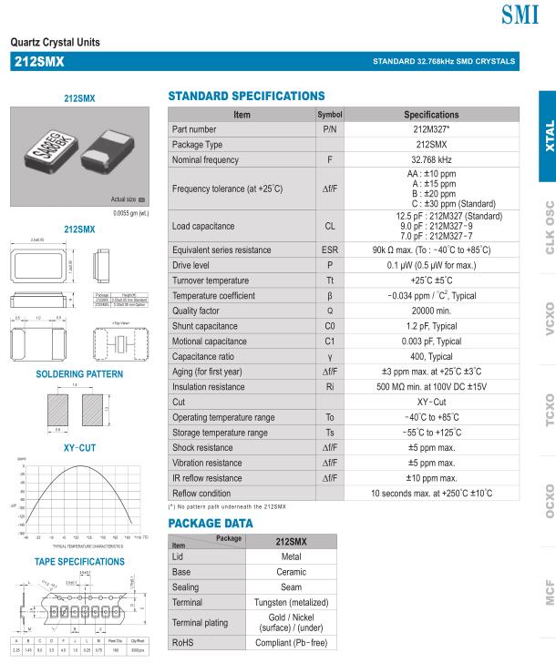 SMI晶振,212SMX晶振,兩腳貼片晶振,貼片表晶32.768K系列具有超小型,薄型,質地輕的表面貼片音叉型石英晶體振蕩器,晶振產品本身具備優良的耐熱性,耐環境特性,在辦公自動化,家電領域,移動通信領域可發揮優良的電氣特性,符合無鉛標準,滿足無鉛焊接的回流溫度曲線要求,金屬外殼的石英晶振使得產品在封裝時能發揮比陶瓷晶振外殼更好的耐沖擊性能.我們積極為電子社會做出貢獻,在穩步的研究和努力的基礎上,快速開發先進的水晶產品。