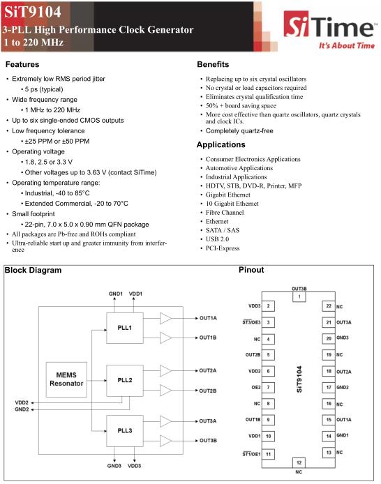 SiTime晶振的可配置解決方案幫助客戶提高產品性能,縮小產品尺寸,提升產品可靠性,并在市場競爭中脫穎而出。SiTime產品采用標準半導體制造工藝和高量產塑料封裝技術的生產流程,提供業界強大的供貨能力和簡短的交貨時間.并且SiTime晶振向市場供應優質的有源晶振,可編程振蕩器等產品。SiTime晶振,SiT9104晶振,OSC差分晶振.