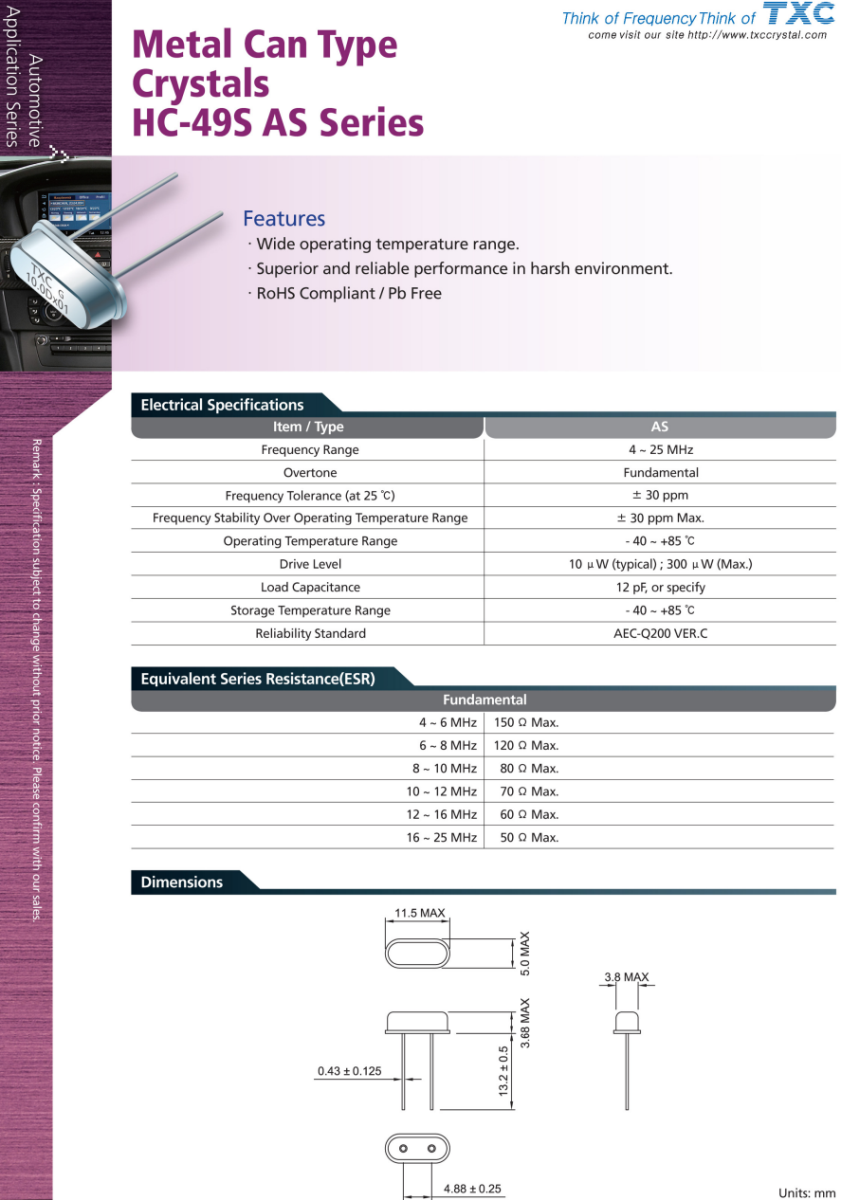 汽車時鐘晶振,臺產TXC晶體,AS-16.9344MAGI-B晶振,臺灣晶技晶振公司,插件晶振,超小型晶振,小型汽車晶振,車載收音機晶振,實時時鐘晶振,汽車級晶振,無源晶振,車載USB晶振,高精度晶振,耐高溫晶振,高品質晶振,臺產晶振,49S晶振,插件晶振,低成本晶振,石英晶振HC-49SAS系列金屬罐類型晶體,特點:工作溫度范圍寬。惡劣環境下性能優越可靠。符合RoHS指令/不含Pb.