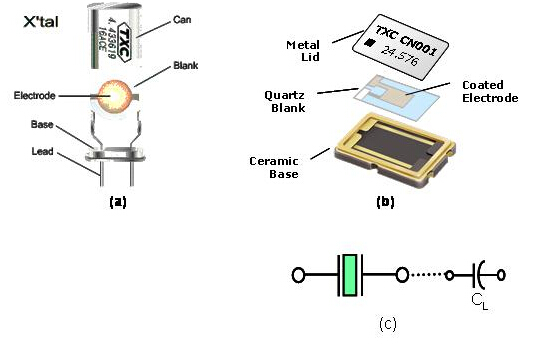 (圖一)(a)及(b)分別是DIP型式及SMD型式的石英振蕩子的基本結構圖. (圖七)(c)是電子電路上所使用代表石英振蕩子的電子符號. 當石英晶體共振子處在遠離振蕩頻率區域時, 石英晶體共振子僅是一個電容性的組件, 當頻率接近石英晶體的振蕩頻率時, 就接近是一個電感性的等效LCR振蕩線路.