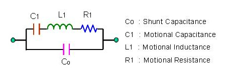 (圖二) 就是將石英晶體共振子轉換成振蕩頻率附近的Butterworth-Van Dyke (BVD)等效電路. 在這個圖中, 有四個主要參數 : 靜態電容-Co, 動態電容-C1, 動態電感-L1及動態電阻-R1.