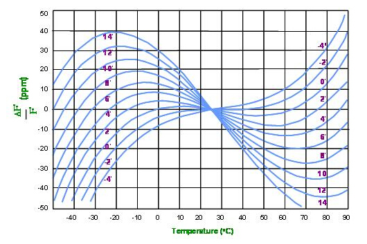 (圖)是以AT切割角度變動在厚度振動模態的頻率對溫度特性的展開圖. 圖中以常用的室溫攝式25度作為相對零點, AT切割的最大優點是頻率對溫度變化為一元三次方曲線. 這個特性, 從(圖六)中可以看到, 在相當寬廣的溫度范圍下, AT切割的溫度曲線的第一階及第二階常數為零, 第三階的常數便決定了頻率對溫度的變化值.