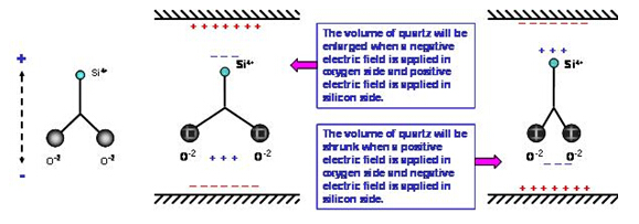 石英材料中的二氧化硅分子(SiO2) 在正常狀態(tài)下, 其電偶極是互相平衡的電中性. 在(圖)的二氧化硅是以二維空間的簡化圖形. 當(dāng)我們?cè)诠柙由戏郊把踉酉路椒謩e給予正電場(chǎng)及負(fù)電場(chǎng)時(shí), 空間系統(tǒng)為了維持電位平衡, 兩個(gè)氧原子會(huì)相互排斥, 在氧原子下方形成一個(gè)感應(yīng)正電場(chǎng)區(qū)域, 同時(shí)在硅原子上方產(chǎn)生感應(yīng)負(fù)電場(chǎng)區(qū)域. 相反的情況, 當(dāng)我們?cè)诠柙由戏郊把踉酉路椒謩e給予負(fù)電場(chǎng)及正電場(chǎng)時(shí), 兩個(gè)氧原子會(huì)相互靠近, 氧原子下方產(chǎn)生感應(yīng)負(fù)電場(chǎng),硅原子上方產(chǎn)生感應(yīng)正電場(chǎng). 然而, 氧原子的水平位置變化時(shí), 鄰近的另一個(gè)氧原子會(huì)相對(duì)的產(chǎn)生排斥或吸引的力量, 迫使氧原子回到原來的空間位置. 因此, 電場(chǎng)的力量與原子之間的力量會(huì)相互牽動(dòng), 電場(chǎng)的改變與水平方向的形變是形成交互作用狀態(tài). 這個(gè)交互作用會(huì)形成一個(gè)在石英材料耗能最小的振動(dòng)狀態(tài), 祇要由電場(chǎng)持續(xù)給與能量, 石英材料就會(huì)與電場(chǎng)之間維持一個(gè)共振的頻率. 這個(gè)壓電效應(yīng)下氧原子的振幅與電場(chǎng)強(qiáng)度及電場(chǎng)對(duì)二氧化硅的向量角度有相對(duì)應(yīng)的關(guān)系.在實(shí)際的應(yīng)用上, 電場(chǎng)是由鍍?cè)谑⑿酒系慕饘匐姌O產(chǎn)生, 電場(chǎng)與二氧化硅的向量角度則是由石英晶棒的切割角度來決定.