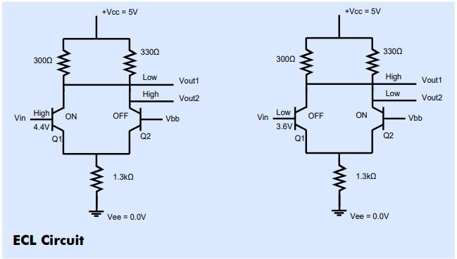 輸入高電壓和低電壓由電源電壓、基極電壓和發射極電壓值定義。在這個例子中,Vcc=5V,Vbb=4V和Vee=0V。這使得高和低的輸入值分別為4.4V和3.6V。