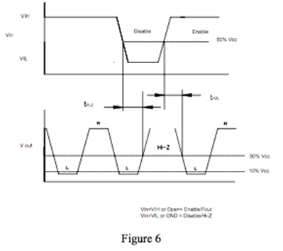 在三態函數生效之前總會有一些延遲.在兩個轉換(禁用和啟用時)都會發生此效果.從低電平開始的三態輸出禁止時間是tPLZ,三態到低電平的輸出使能時間是tPZL.(圖6)
